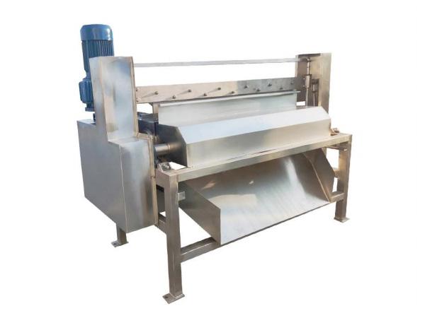 該機主要用于桃、杏等核果類水果在常溫下去核。在核果類水果的果漿生產線上是關鍵設備之一。通過旋轉的齒輥和膠輥除去桃子、杏子中的果核得到塊狀果肉。兩輥之間的間距根據不同的水果而定,水果由前道設備送入進料斗由曲柄連桿機構帶動壓果板把水果壓入兩之間。兩根輥相互對轉,水果上大部分果肉被壓入齒銀的縫隙中,果核被擠在具有彈性的膠輥內,梳子板把果肉從齒盤片間隙內挖出。帶果肉的果核進入洗核部件完成肉核分離。